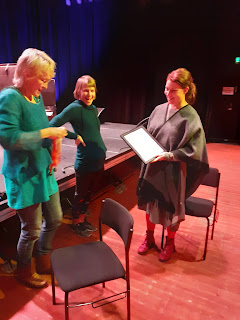 Kuva: Palkinnonjako Teatteri Tuomikko/Terhi Tuomikko, jakajina mentorit Anne Lihavainen ja Merja Pöyhönen.