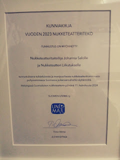 Suomalaisen nukketeatterin päivänä 11.02.2024 jaettiin vuoden 2023 nukketeatteritekotunnustus Johanna Salolle ja Teatteri Liikutukselle tunnustuksena tulisieluisesta ja monipuolisesta nukketeatteritoiminnasta pohjoisimassa Suomessa ja kansainvälisillä näyttämöillä. Nukketeatterin julistuksen vuodelle 2024 esitti viime vuonna palkittu Metropolitan Puppets. Voit lukea julistuksen tästä linkistä Suomalaisen nukketeatterin päivänä 11.02.2024 Suomen UNIMA vietti 40 v. -juhlaansa.